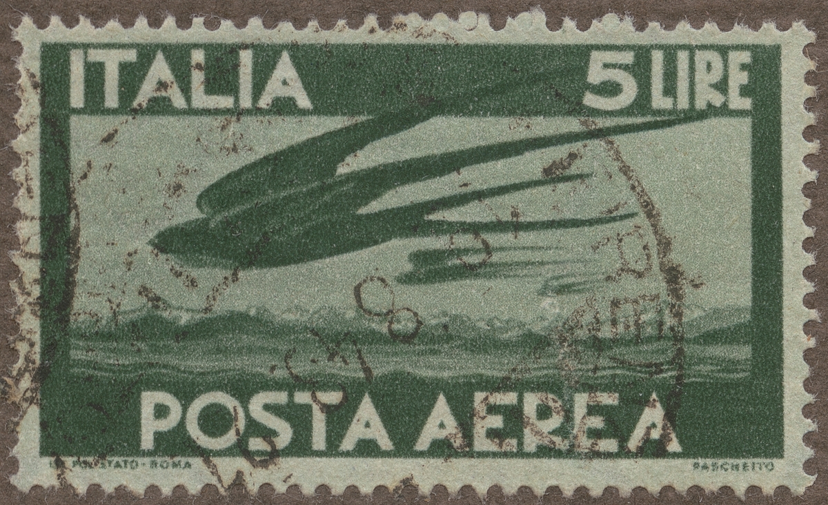 Frimärke från Italien, 1945. Motiv av Svalor som symbol för flygposten