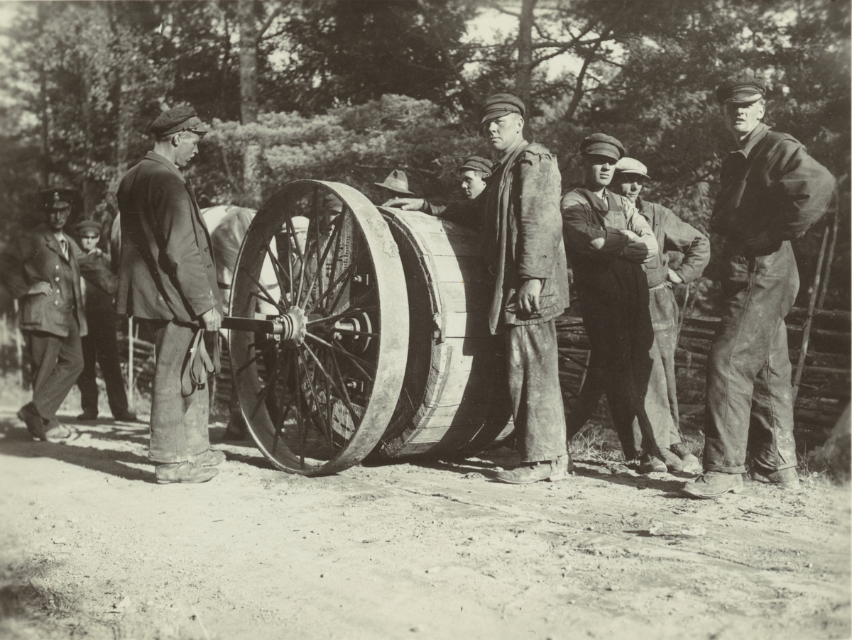 Finnvikskabeln. Transport av kabeltrumma.Ur albumet Kabelarbetet Hjälmsälra (Hjälmsättra) - Norrtälje - Finnviken utfört under sommaren 1928.