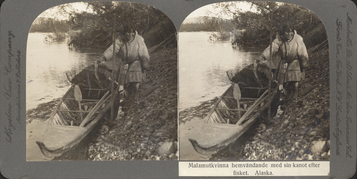 Stereobild av Malamutkvinna hemvändande med sin kanot efter fisket.