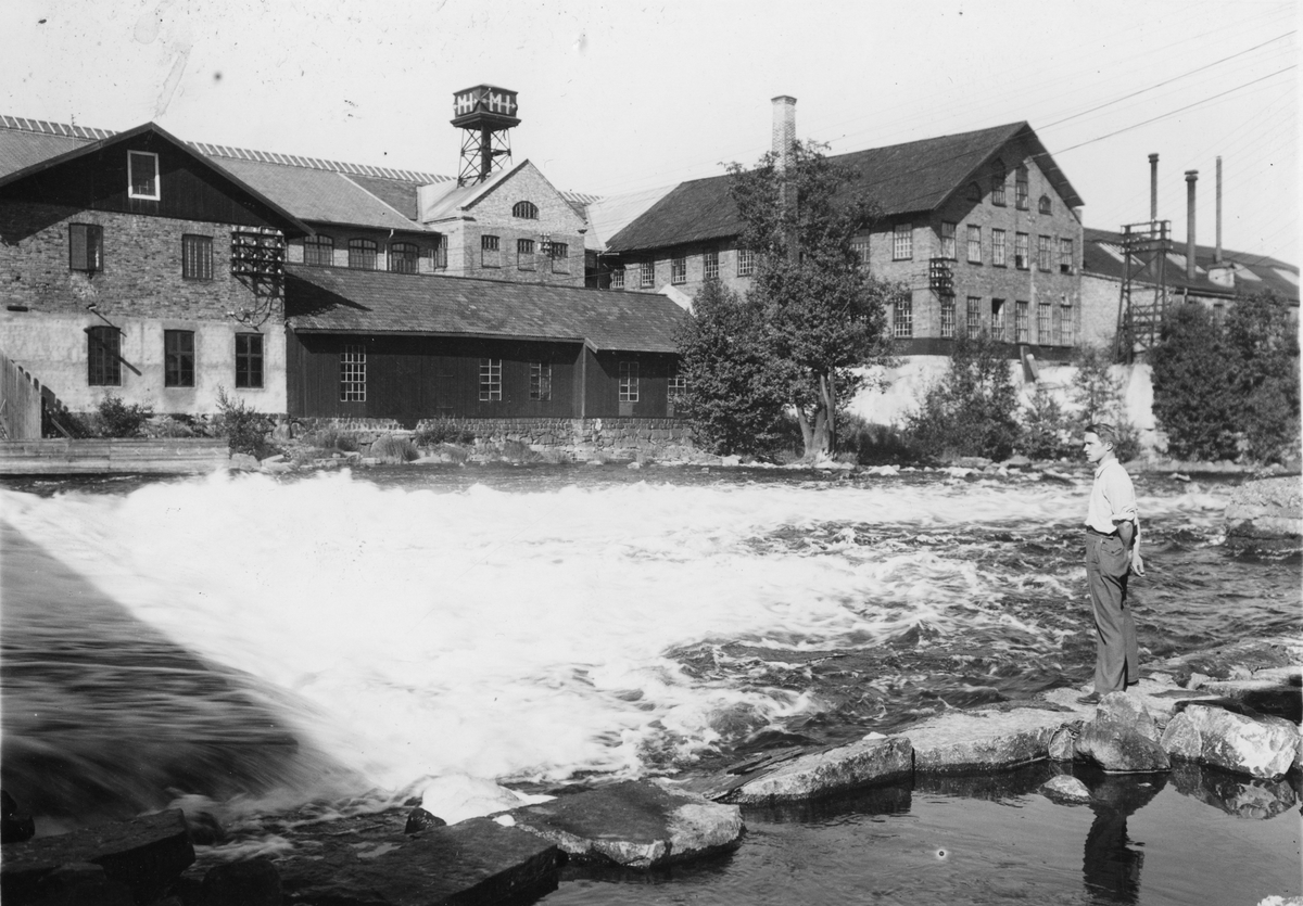 Morgårdshammars Mekaniska Verkstad. Nedanför fallet och intill Bergslagsälven ligga de äldsta verkstadsbyggnaderna med den gamla smedjan i mitten.