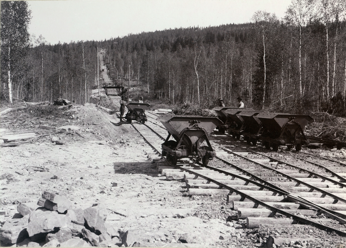 Transportbanor. Bilden visar rutschbanan för malm från Lekombergs gruvor ned till färjeläget vid sjön Vässman. Landsvägsbron över banan ses en bit upp.