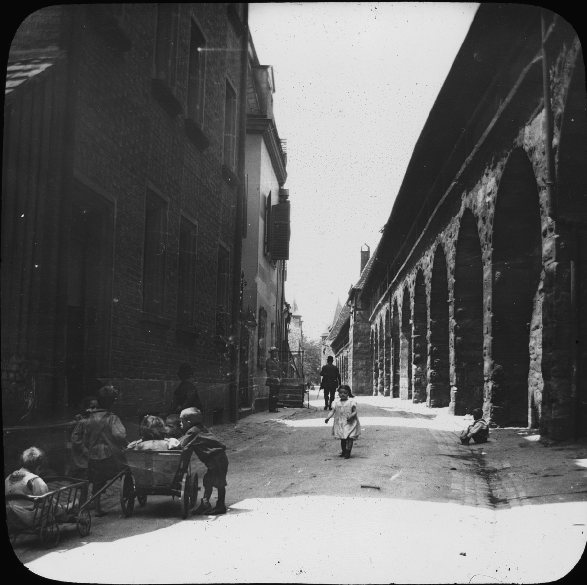 Skioptikonbild med motiv av lekande barn på gata i Nürnberg.