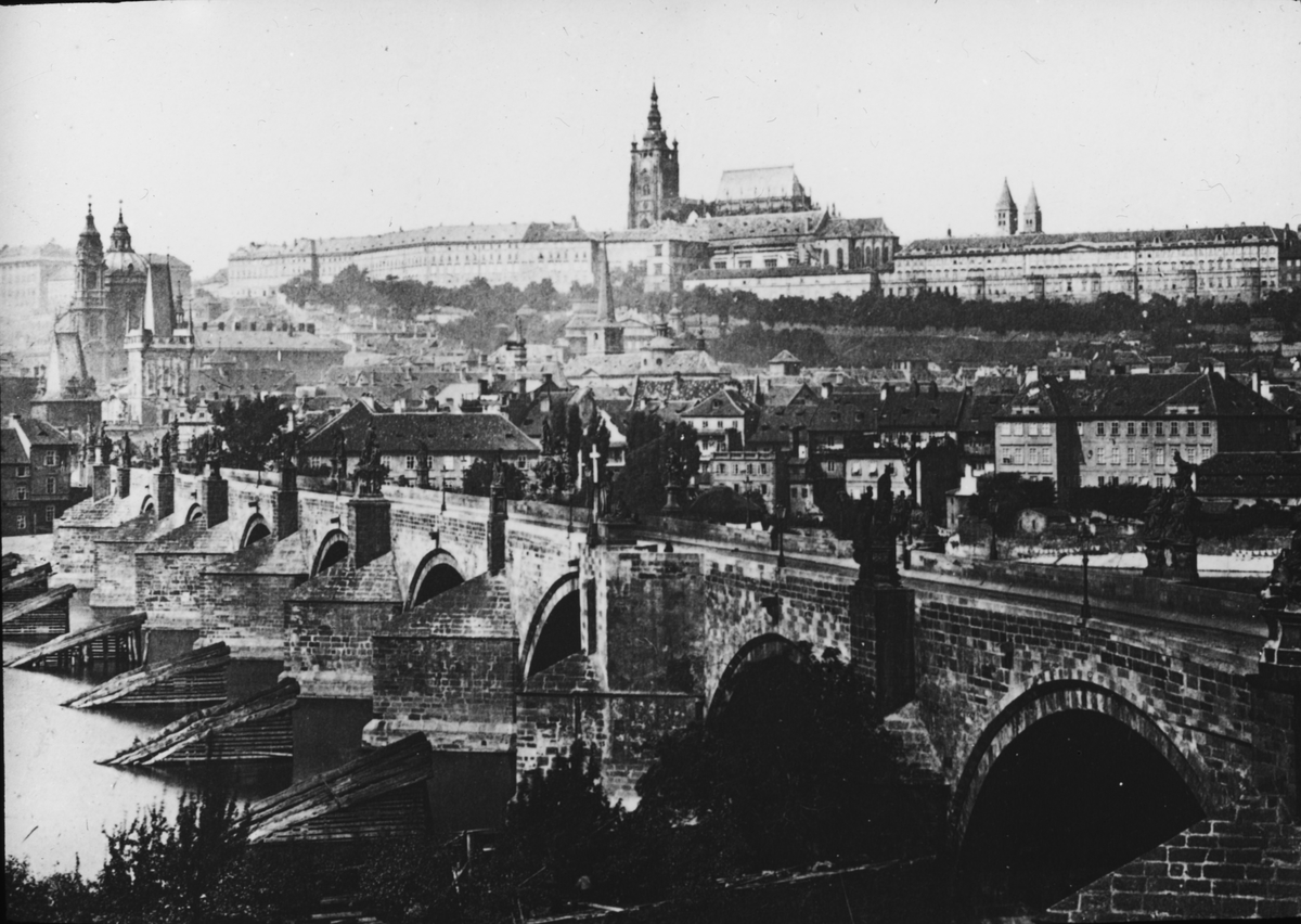 Skioptikonbild med motiv av vy över Prag och Karlsbron.