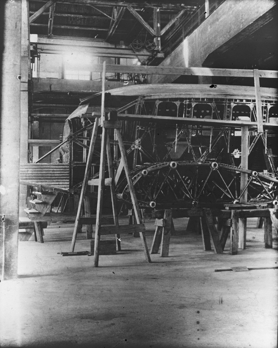 Titel: Skioptikonbild med motiv från flygplansverkstad. Byggandet av Junkersflygplan.