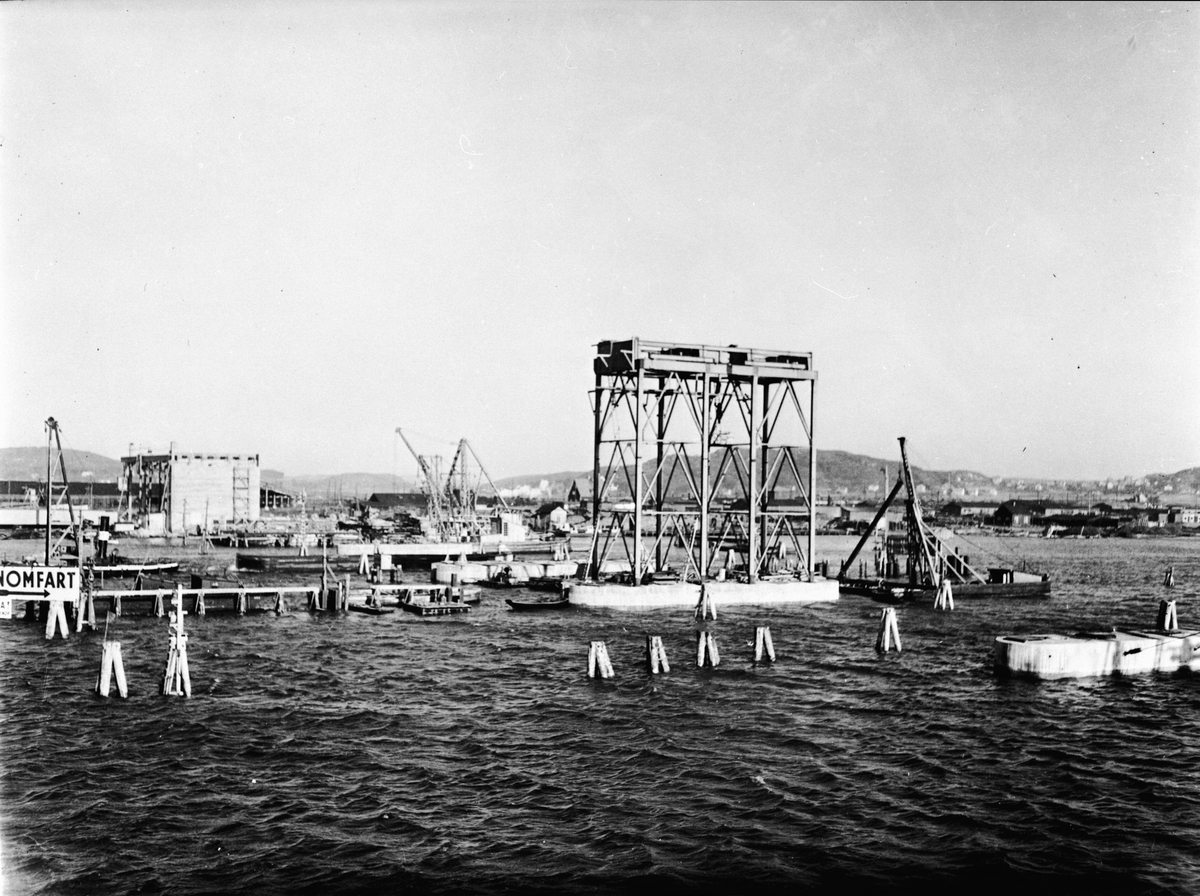 Byggherre: Byggnadsaktiebolaget Contractor, Stockholm. Götaälvsbron. Arbetsbild med delvis färdiga bro pelare ute i älven.