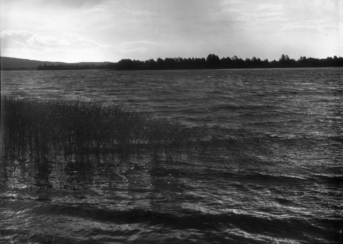 Titel: Diapostiv, fönsterbild med motiv av sommarlandskap, möjligen från Sävsjö. Vy över sjö.