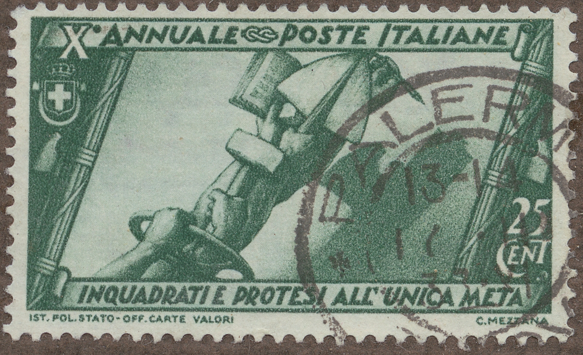 Frimärke från Italien, 1932. Motiv av Samling av verktyg Symbol för gemensamt arbete (t.v. och t.h.): romerska "fasces" eller spöknippen: emblem för italienska Fascistpartiet.- "Serie: 10-årsminne av Fascistregeringen och marschen mot Rom, 1922-1932."