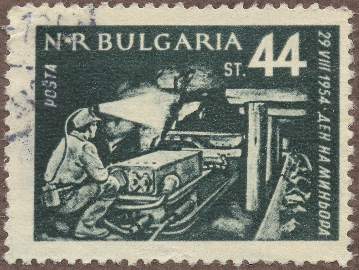 Frimärke från Bulgarien, 1954. Motiv av Transport nere i en gruva - Propaganda för Gruvarbetarnas Dag-