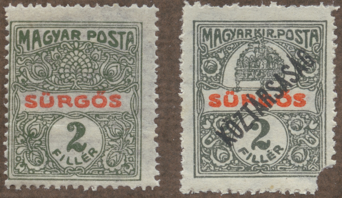 Frimärken från Konungariket Ungern, 1916. Motiv av Ungerskt expressbrev frimärke (märket t.h.: med S:ct. Stefanskronan)