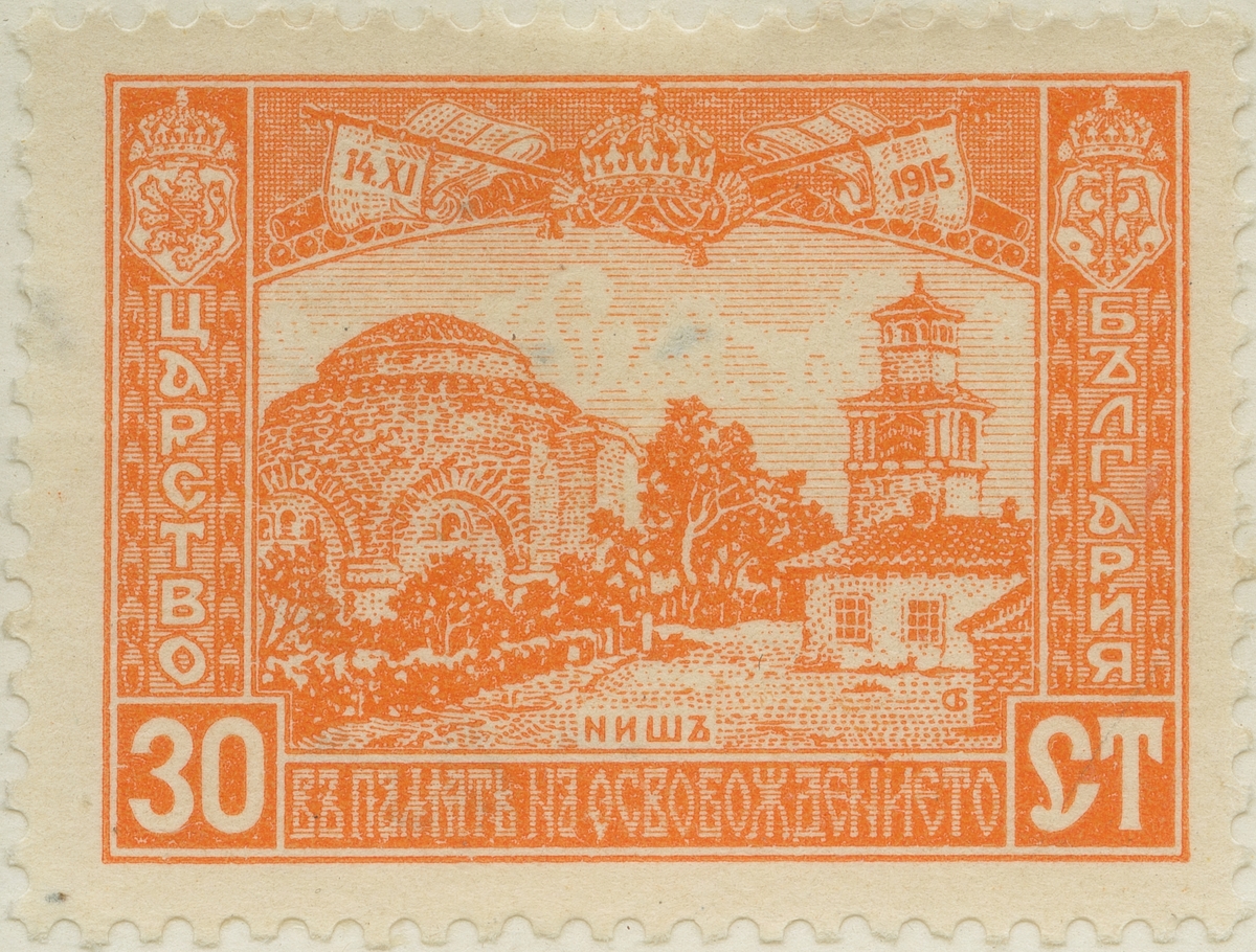 Frimärke från Bulgarien, 1916. Motiv av Staden Nisch Macedoniens Befrielse