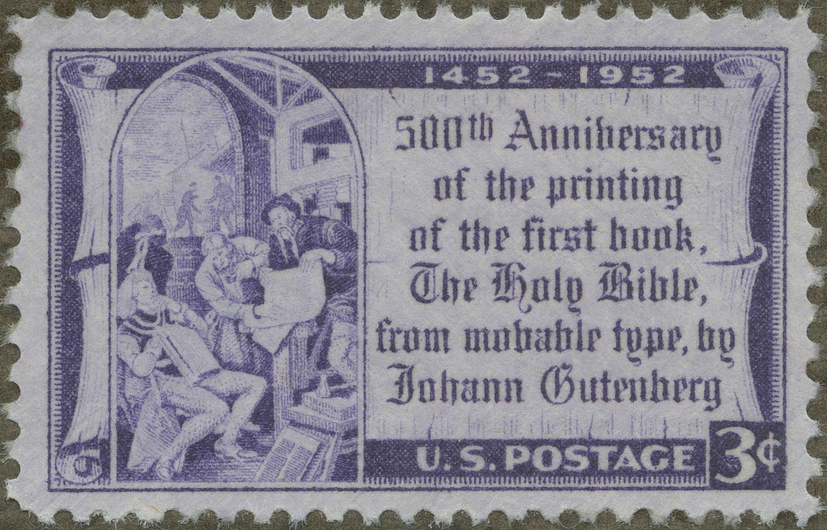 Frimärke från U.S.A., 1952. Motiv av Johann Gutenbergs tryckning av den första bibeln med lösa typer 500-års minne 1452-1952.