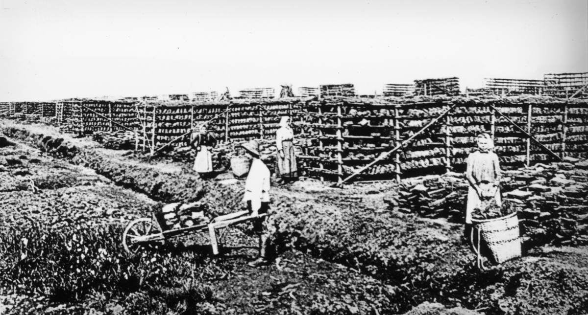 Skioptikonbild med motiv av torvbrytning på okänd mosse.