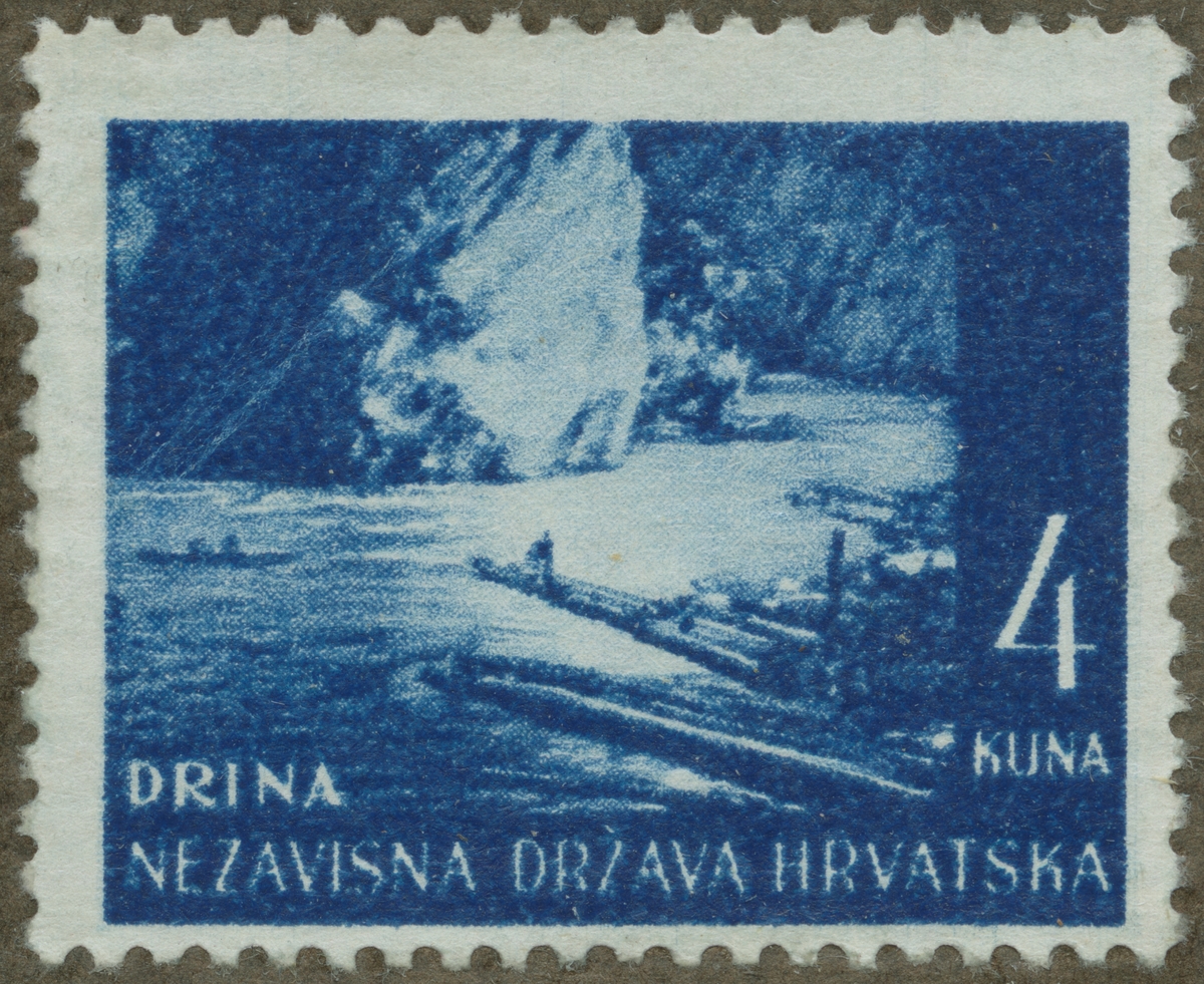 Frimärke ur Gösta Bodmans filatelistiska motivsamling, påbörjad 1950. Frimärke från Kroatien, 1941. Motiv av "Fabriksanläggning vid floden Drina i Kroatien."