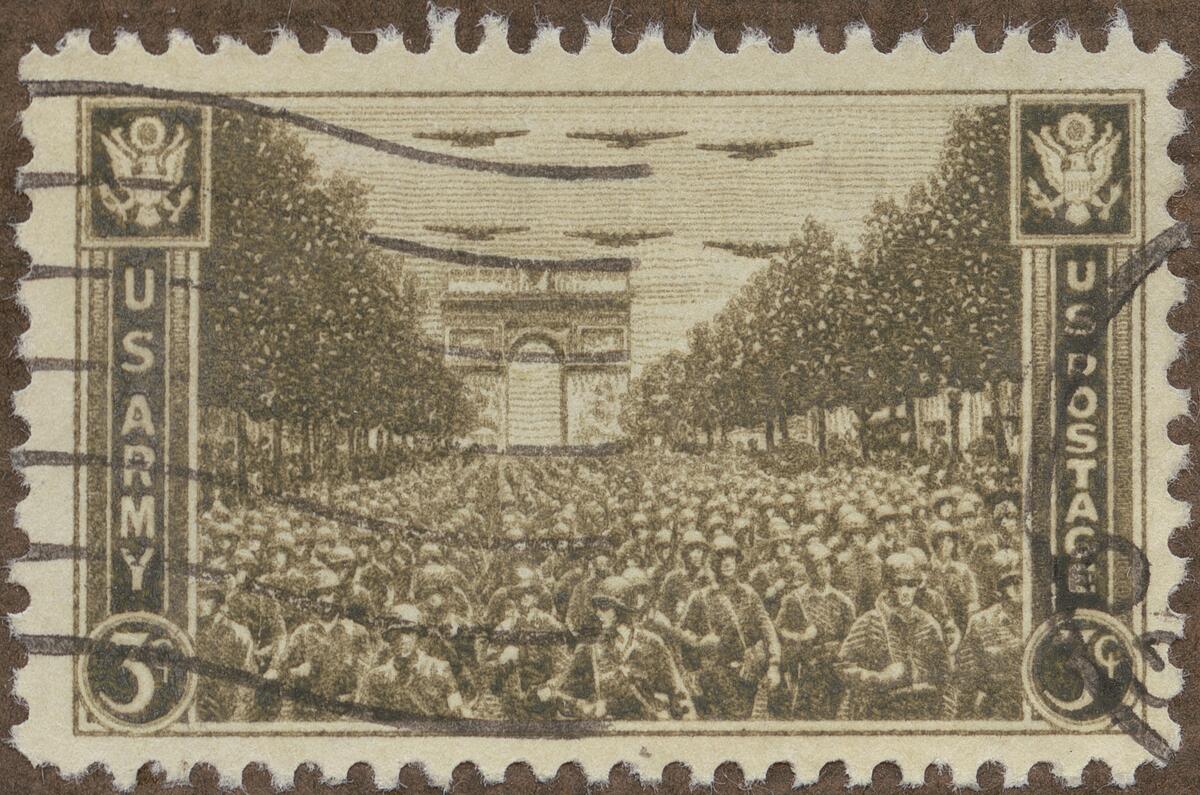Frimärke från U.S.A., 1945. Motiv av Amerikanska trupper marscherar förbi Triumfbågen i Paris på Champs Élyssées avenyn med äreseskort av 6 bombplan. -Minne av amerikanska flottans insats i världskrig II-: 1940-1945.