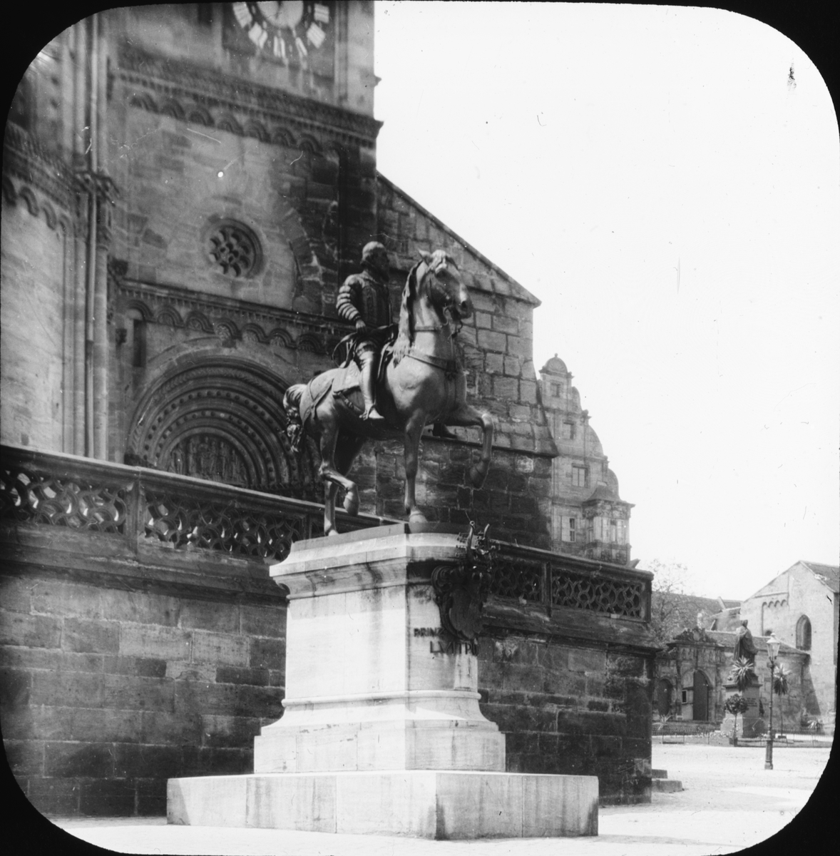 Skioptikonbild med motiv av staty framför kyrka i Bamberg.