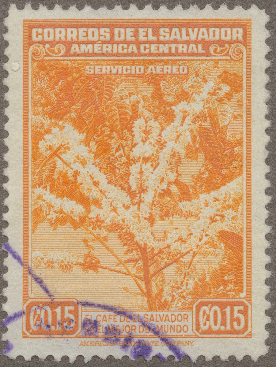 Frimärke från Salvador, 1940. Motiv av kaffeplanta med blommor.