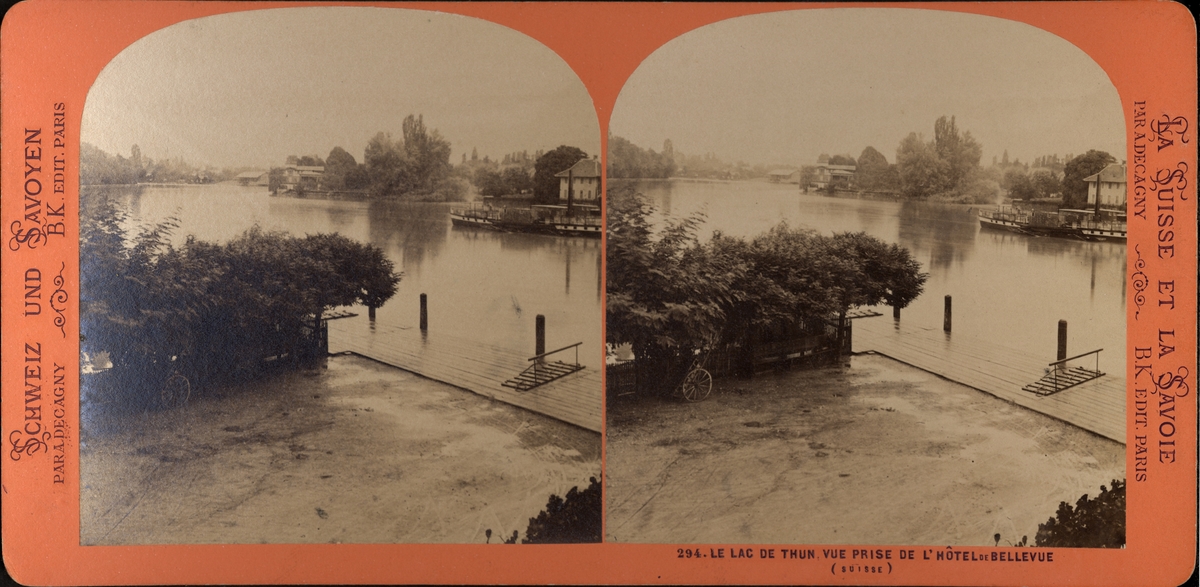 Stereobild av sjön i Thun, vy nedanför hotellet Bellevue.