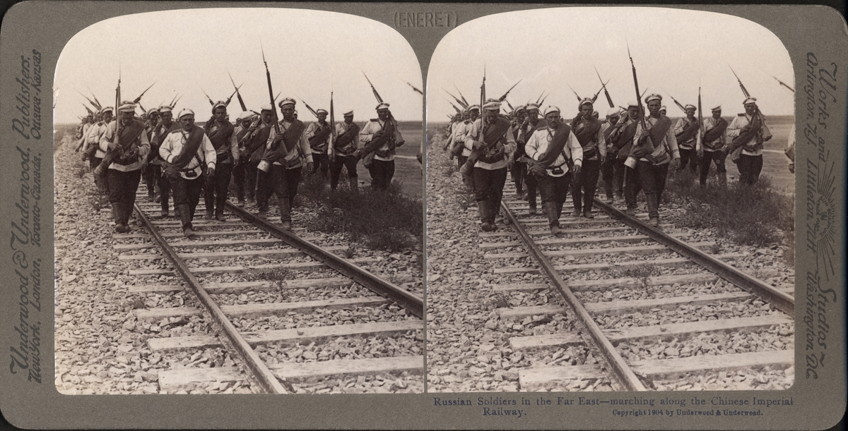 Stereobild av ryska soldater, marscherande på Chinese Imperial Railway i fjärran Östern