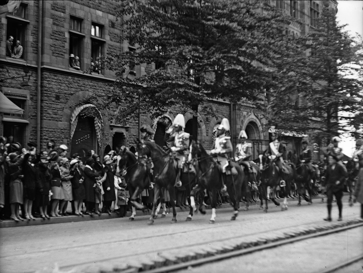 Glasplåt med motiv från Gustaf V:s 70-årsdag. Parad med hästar.