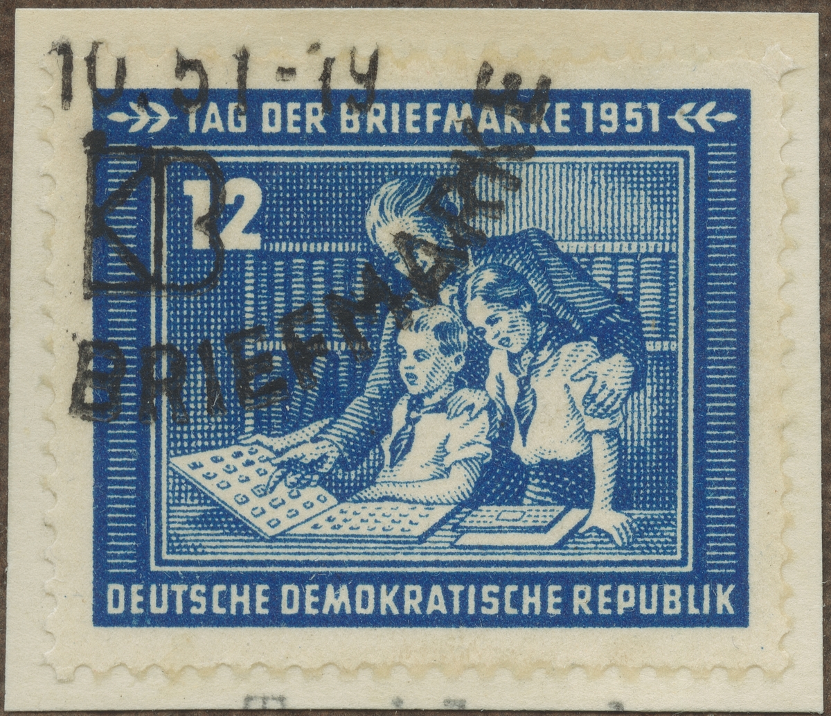 Frimärke från Tyskland, 1951. Motiv av Pappa med frimärkssamlande barn "Frimärkets Dag"