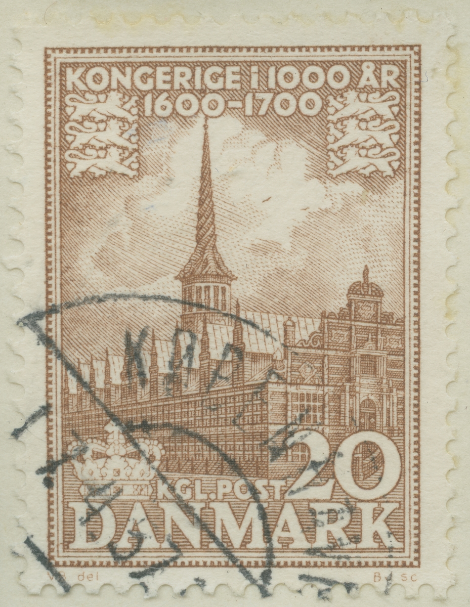 Frimärke från Danmark, 1954. Motiv av Börshuset i Köpenhamn (1600-1700-talet). "serie: Danmark: Kungarike i 1000 år".