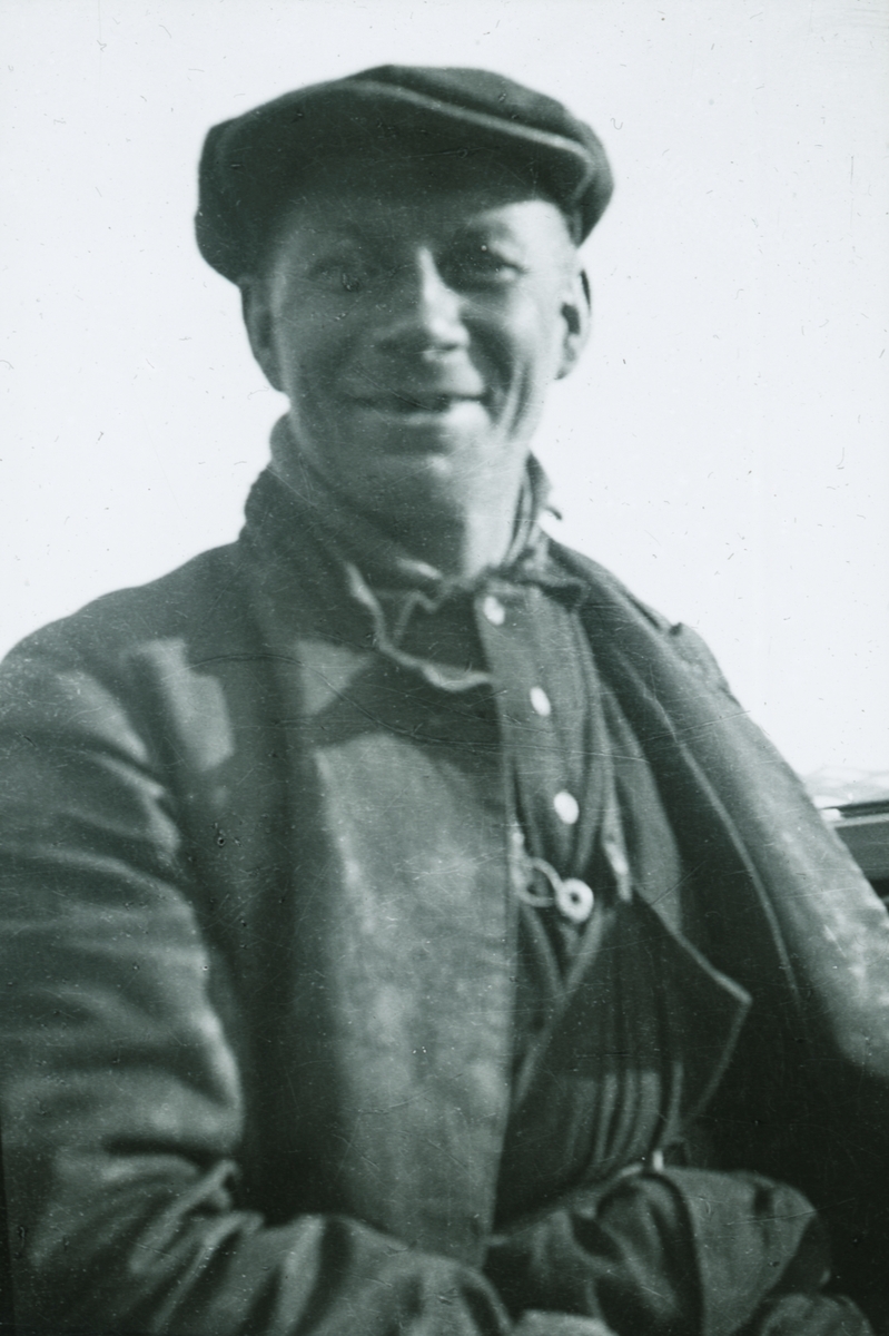 Glasnegativ med motiv av leende man med keps och skinnjacka.