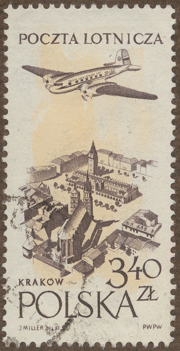 Frimärke från Polen, 1957. Motiv av Tvåmotorigt monoplan över Gamla torget i Krakow