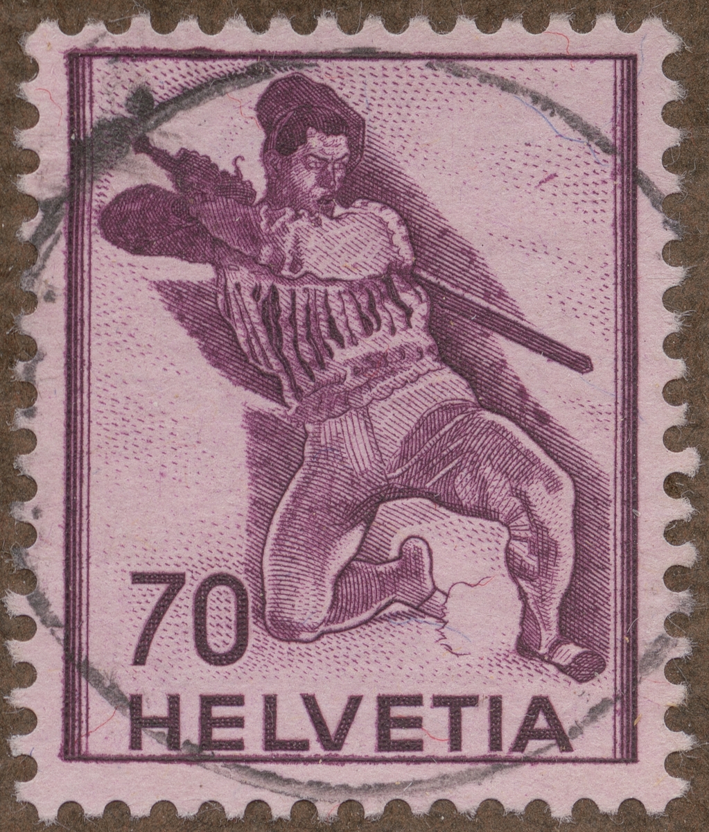 Frimärke från Schweiz, 1941. Motiv av Sårad schweizisk krigare med svärd (efter tavla: "Retour de Marignon" av F. Hödler)