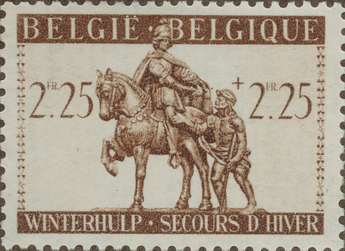 Frimärke från Belgien, 1942. Motiv av St. Martin som offrar sin kappa.