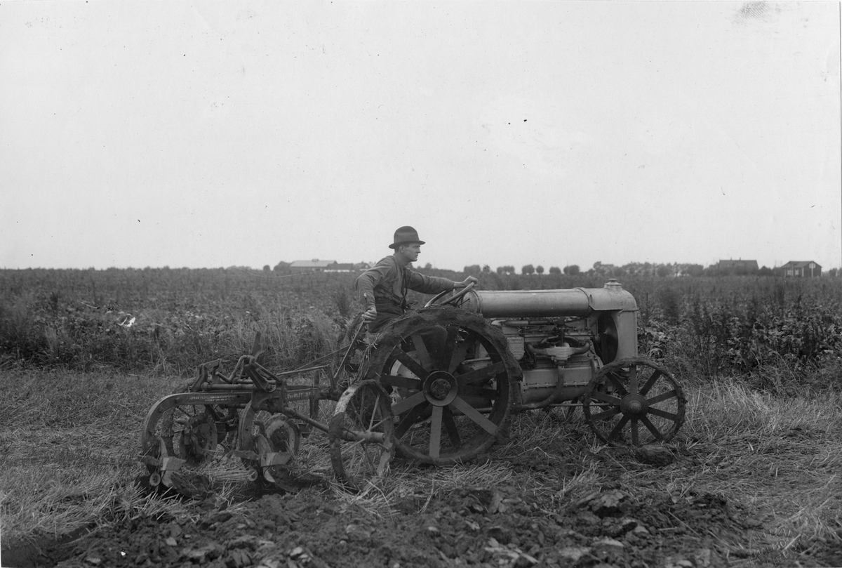 Fordonstraktor med plog.