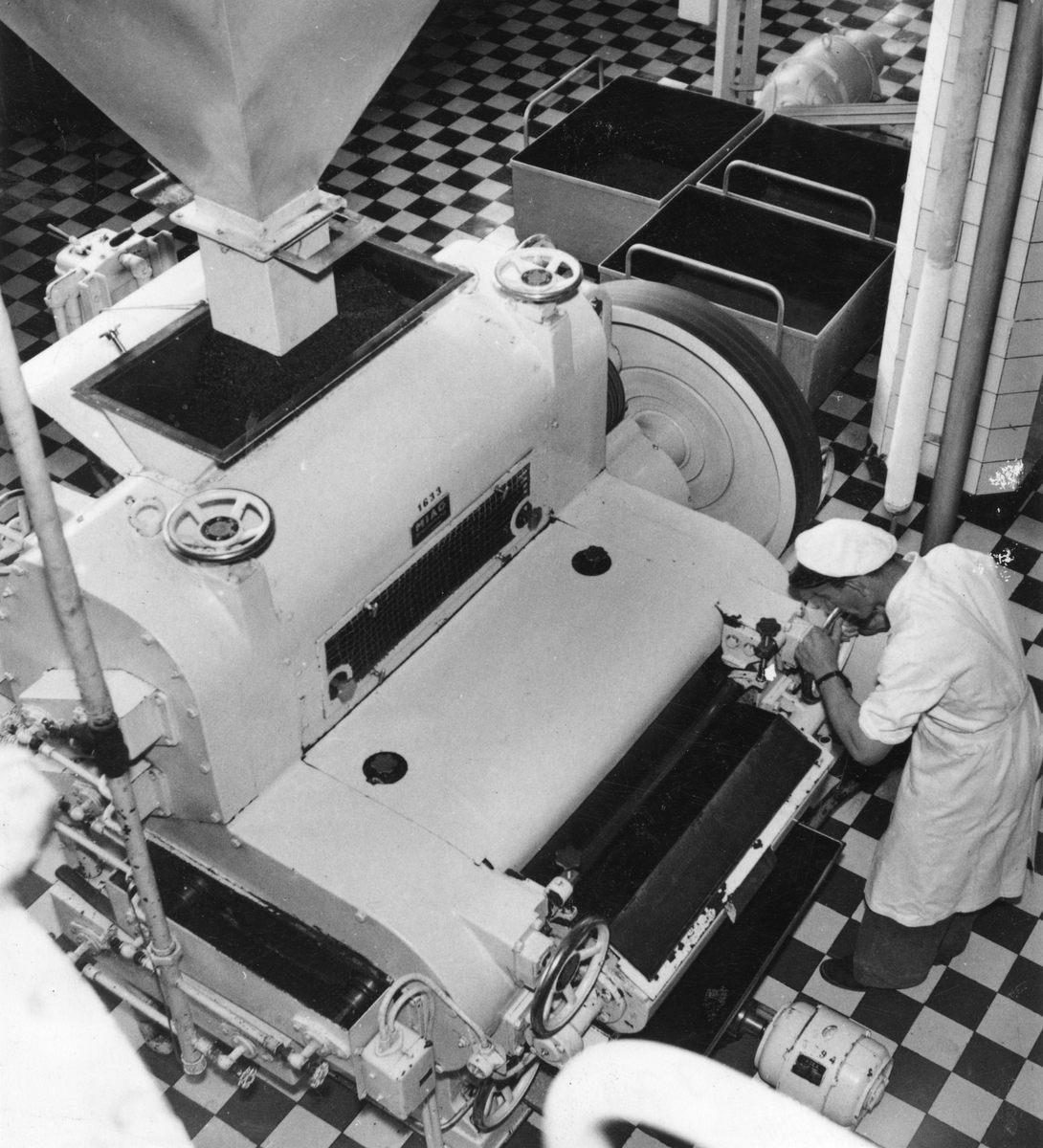Arbete i chokladfabriken i Ljungsbro. Efter rensning, rostning och krossning malas kakaobönorna mellan valsar av rostfritt stål. Härvid erhålles en kakaomassa av tjockflytande konsistens. Bilden visar en maskin vari malningen sker.