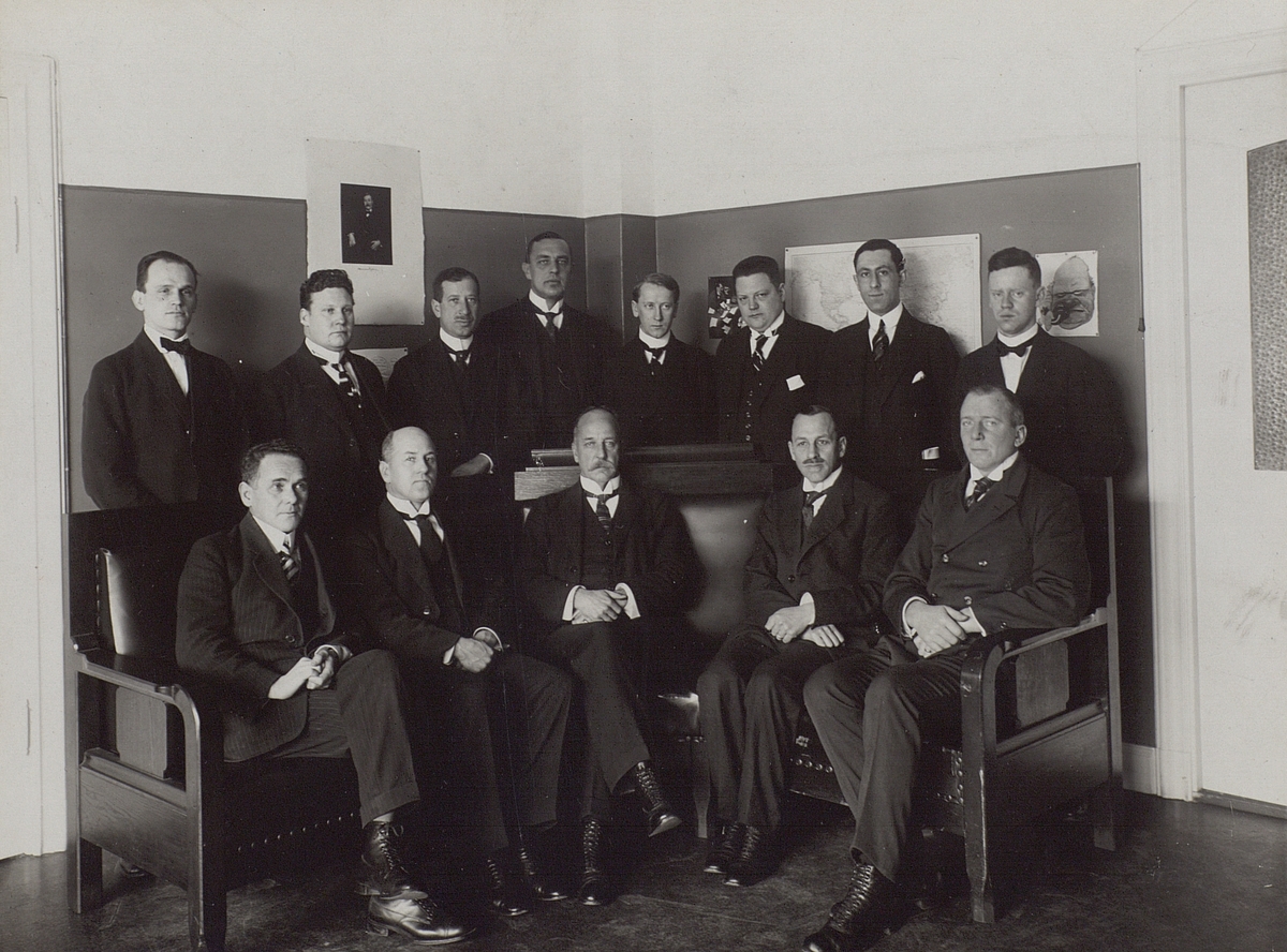 Befälet på Stockholms telefonstation omkr. 1925. Förste kontrollör Hugo Jonsson, överkont-rollör Mauritz Agrell, telefondirektör Anders Lignell, förste kontrollör Sven Backelin, förste kontrollör Oskar Jonsson, assistent Carl Håkansson, förste kontrollör Johan Wennerström, förste kontrollör Peltin Goldschmidt, kontrollöi Torsten Schön, kontrollör Ragnar Björnsson, förste assistent Fritiof Kallen, assistent Oscar Her-son och assistent Axel Gunnarsson.