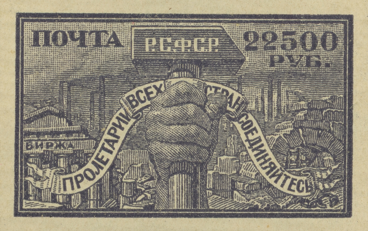 Frimärke ur Gösta Bodmans filatelistiska motivsamling, påbörjad 1950. Frimärke från Ryssland, 1922. Motiv av "Hand med hammare. Fabriksverkstäder Symbol för kommunismen"