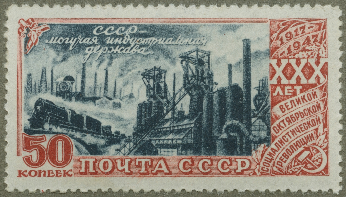 Frimärke ur Gösta Bodmans filatelistiska motivsamling, påbörjad 1950. Frimärke från Ryssland, 1947. Motiv av "Symbol för rysk industri - 30-årsminne av ryska revolutionen 1917 - "