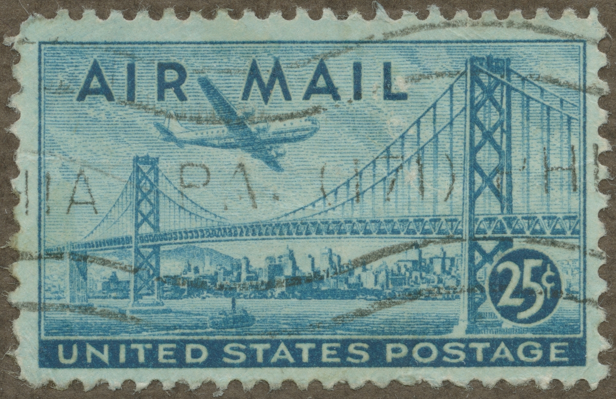 Frimärke från U.S.A., 1947. Motiv av Hängbron över San Fransisco- Oakland Bay.