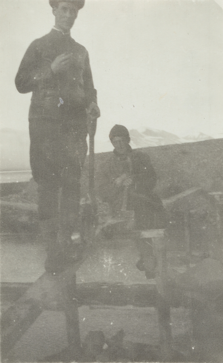 Fotografi från expedition till Spetsbergen. Motiv av två män som sitter och står på en träställning.