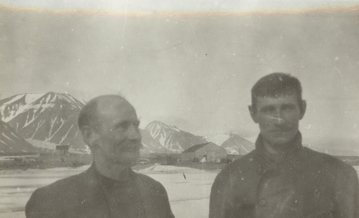 Fotografi från expedition till Spetsbergen. Motiv av två män som poserar framför snötäckta berg.