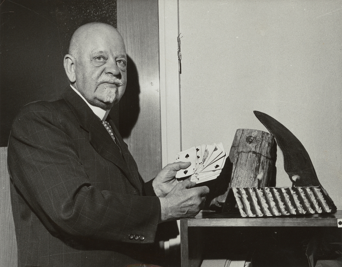 Fotografi från första svenska Antarktisexpeditionen 1901-1904. Porträtt av Gösta Bodman som visar en kortlek.
