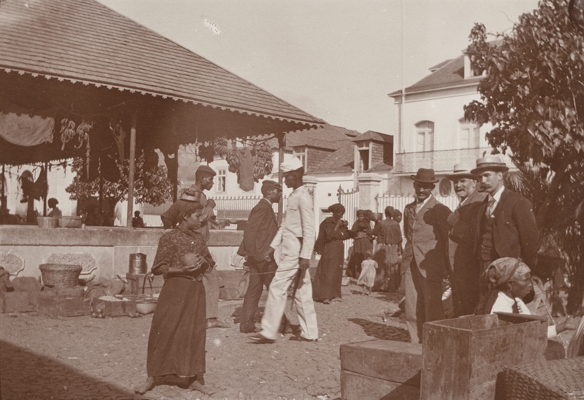 Fotografi från första svenska Antarktisexpeditionen 1901-1904. Motiv av expeditionsdeltagare framför hus på torg i stad.