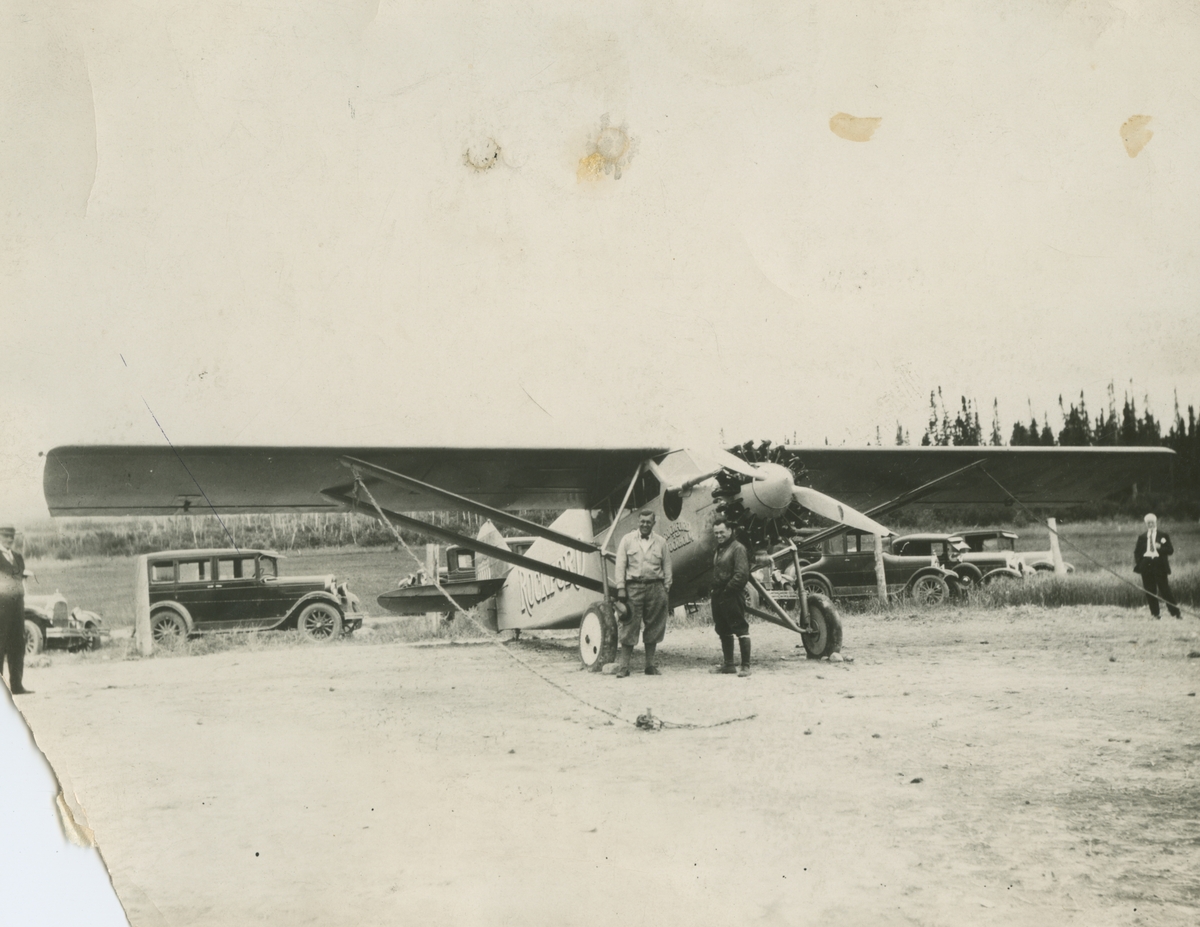 Fotografi från låda märkt Bernt Balchen. Balchen var norsk-amerikansk flygare, polarforskare och militär. Motiv av två män framför flygplan.