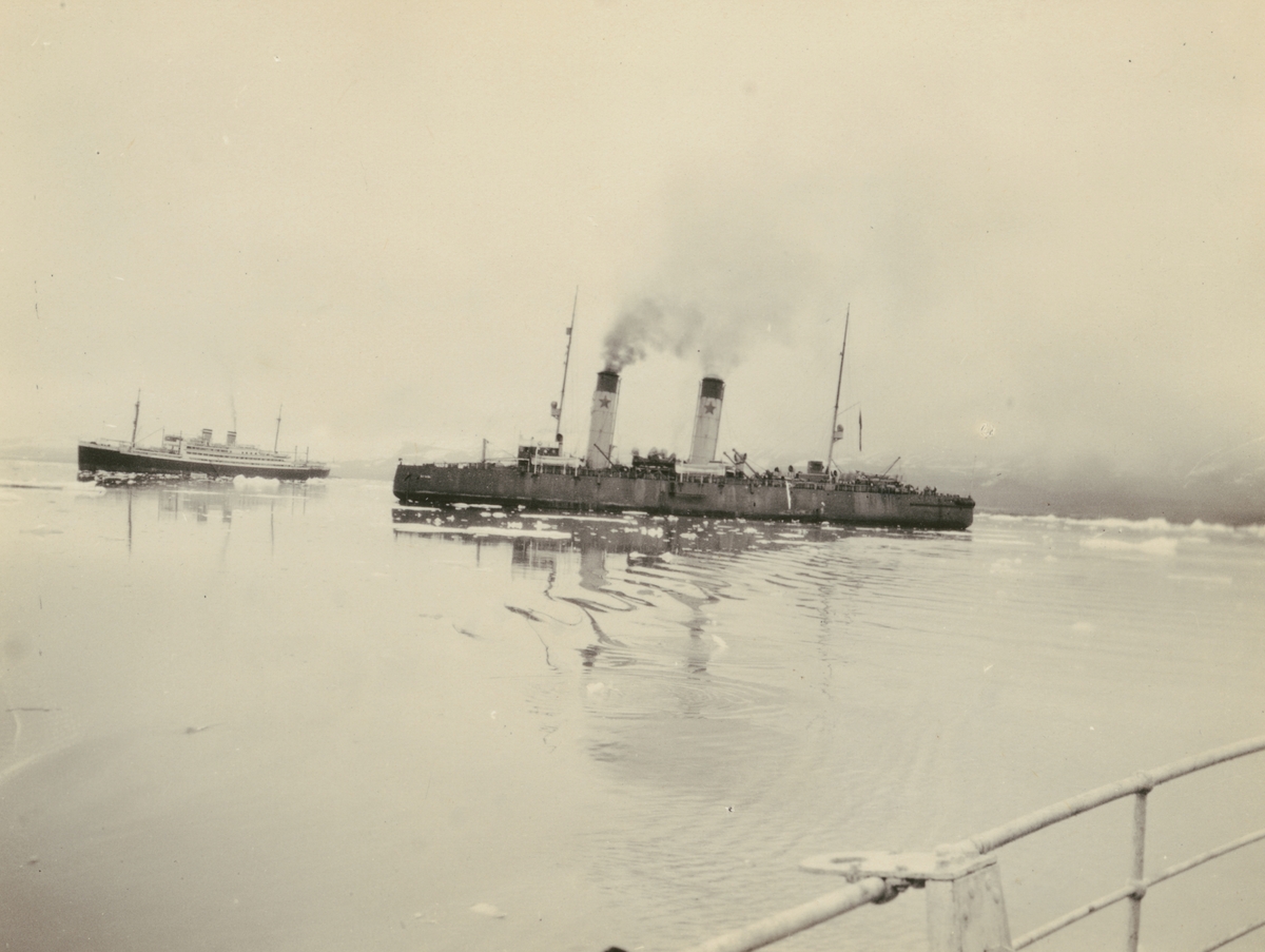Fotografi från svenska undsättningsexpeditionen 1928. Motiv av fartyg i hav.
