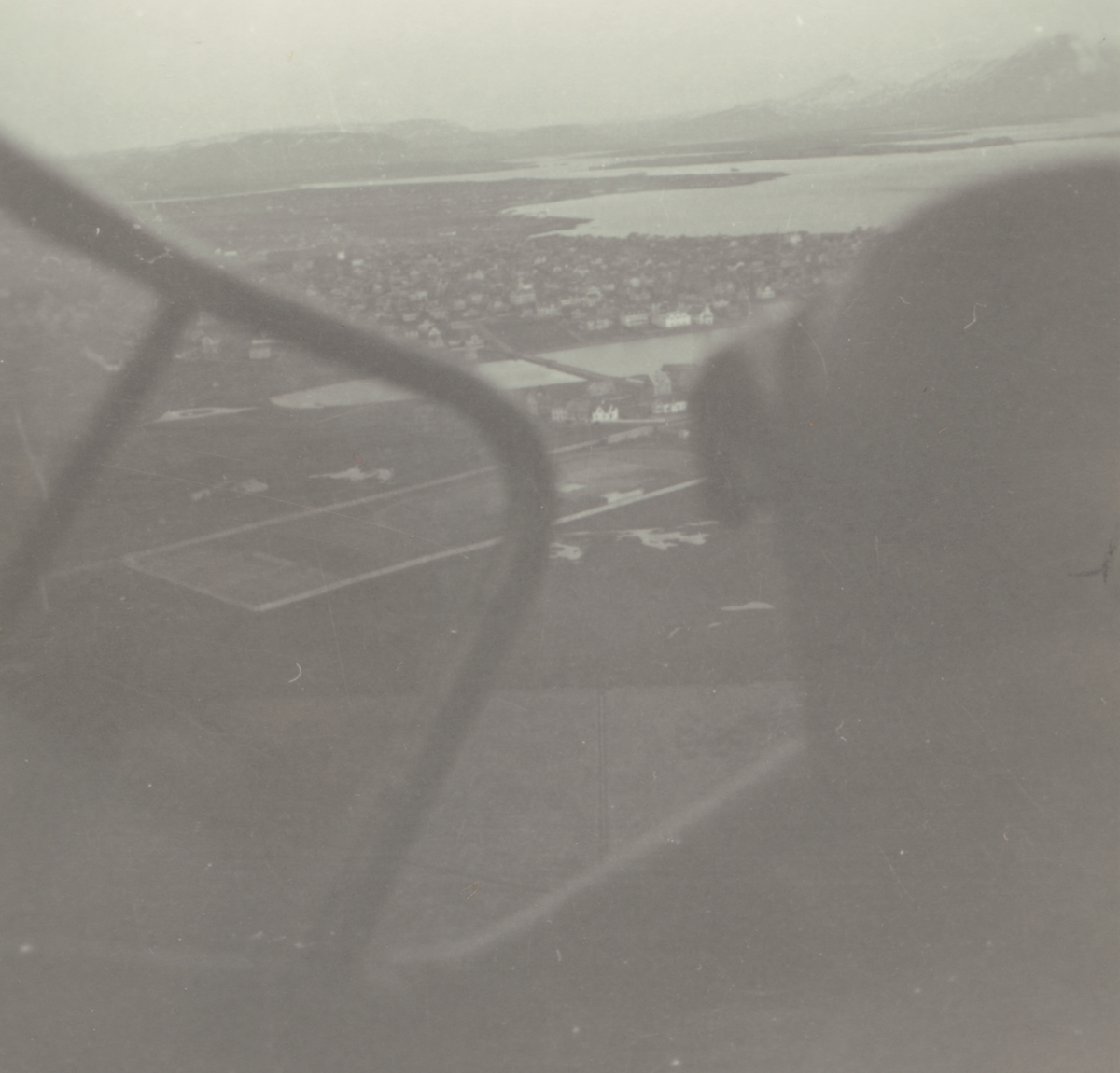 Fotografi från Albin Ahrenbergs resa till Grönland 1929. Vy över kuststad och berg. Bilden är tagen från flygplan och pilot och cockpit syns i förgrunden.