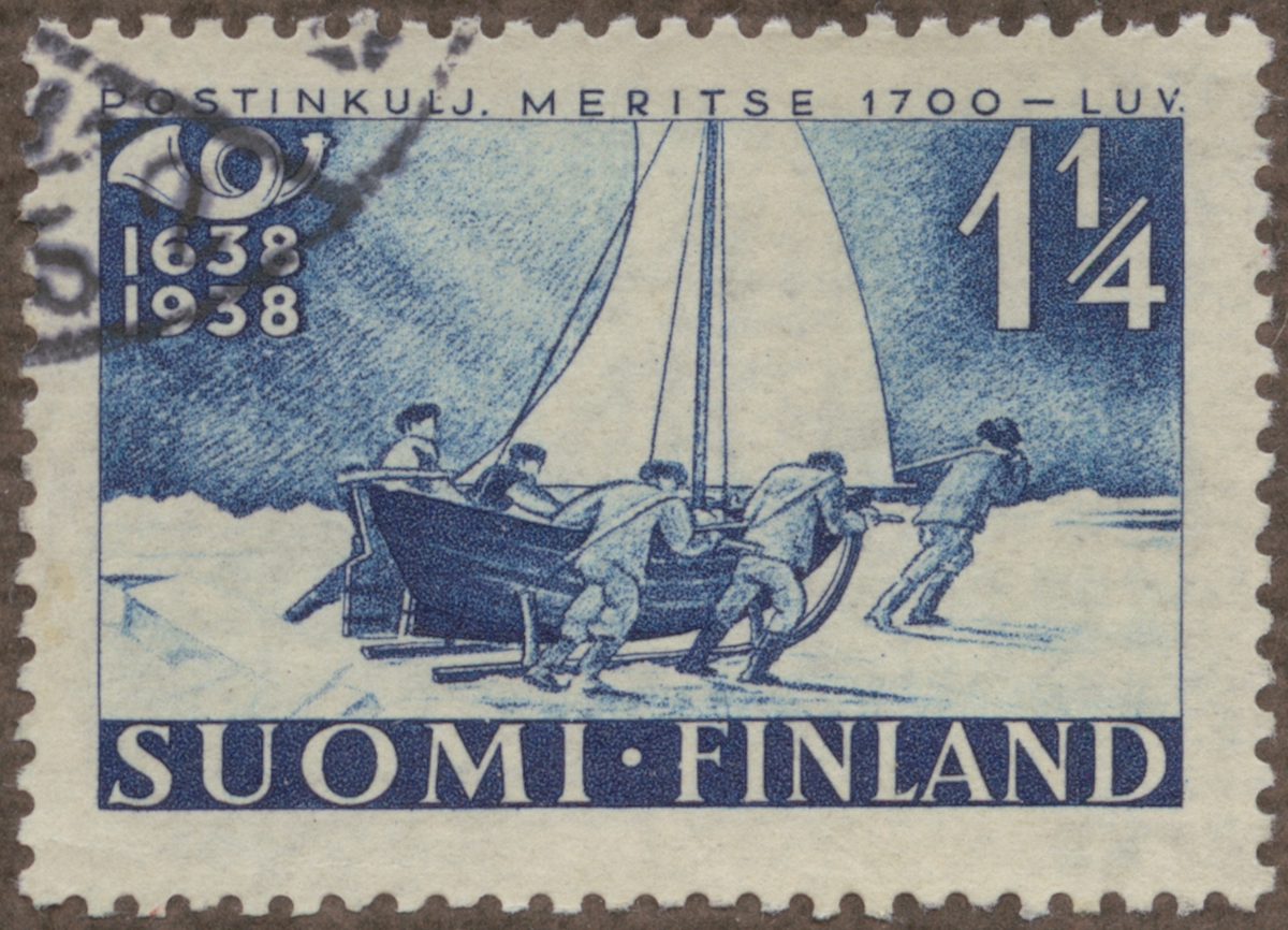 Frimärke från Finland, 1938. Motiv av Finsk vinterpostbåt över Ålands Hav under 1700-talet Finska posten 300-år 1638-1948