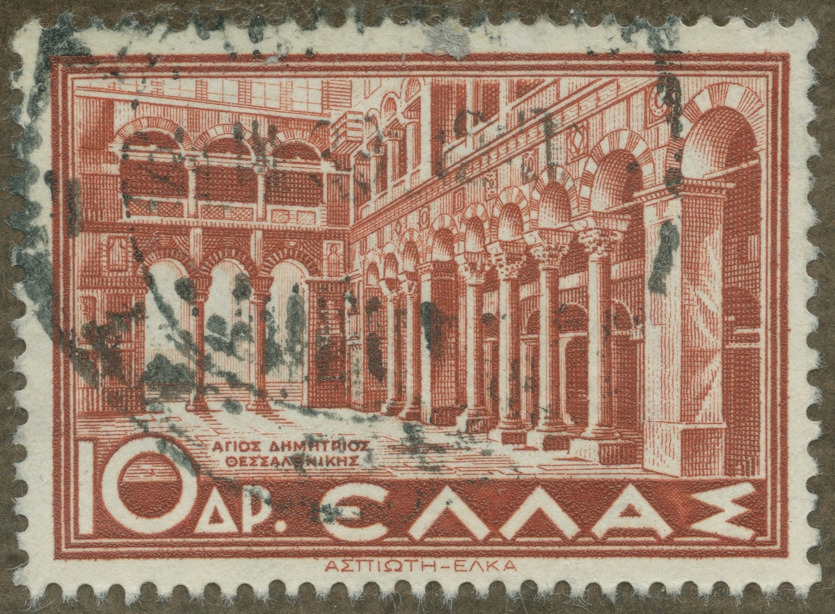 Frimärke från Grekland, 1937. Motiv av St. Demetrius byzantinska kyrka i Saloniki.