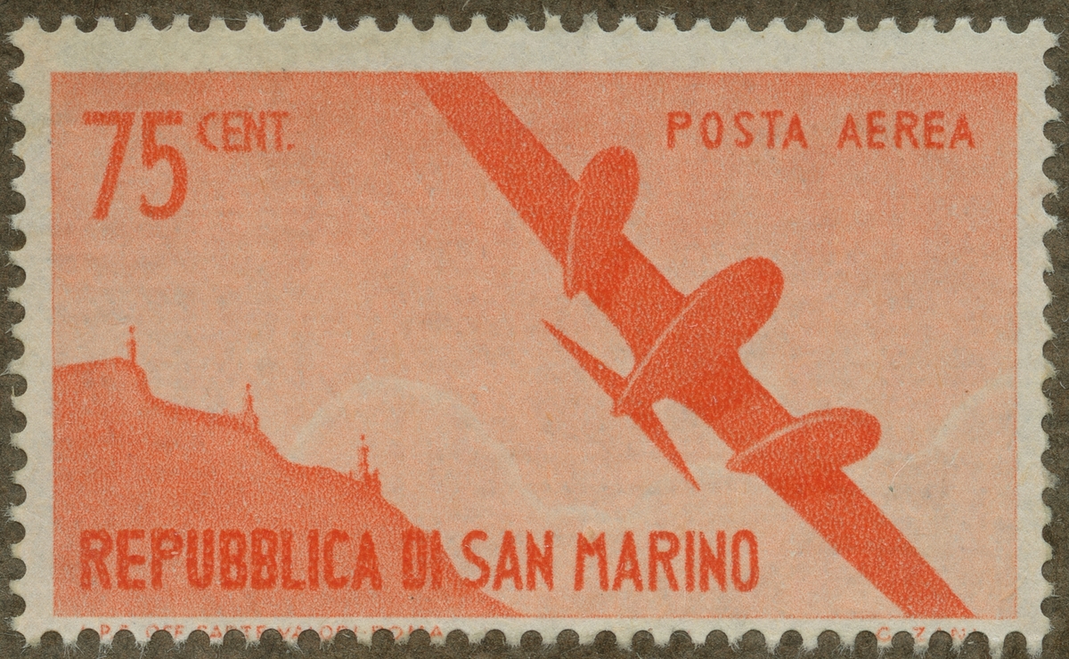 Frimärke ur Gösta Bodmans filatelistiska motivsamling, påbörjad 1950. Frimärke från San Marino, 1946. Motiv av Konturbild av San Marino klippan "-Tvåmotorigt postflygplan-"