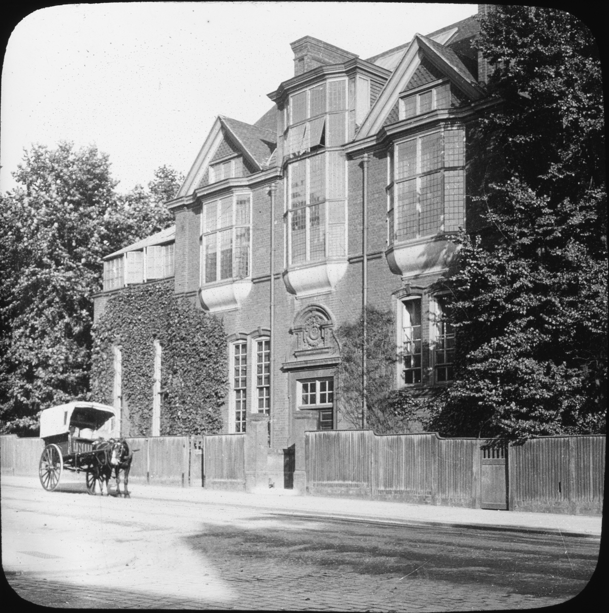 Skioptikonbild med motiv av hästskjuts utanför hus i London.