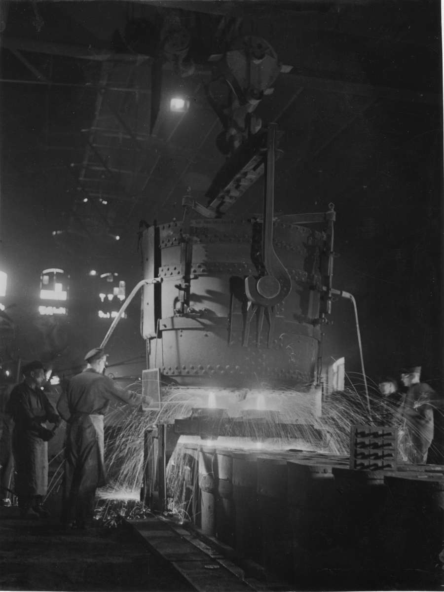 Tappning i kokiller av martinstål vid Fagersta Bruk, 1949.
