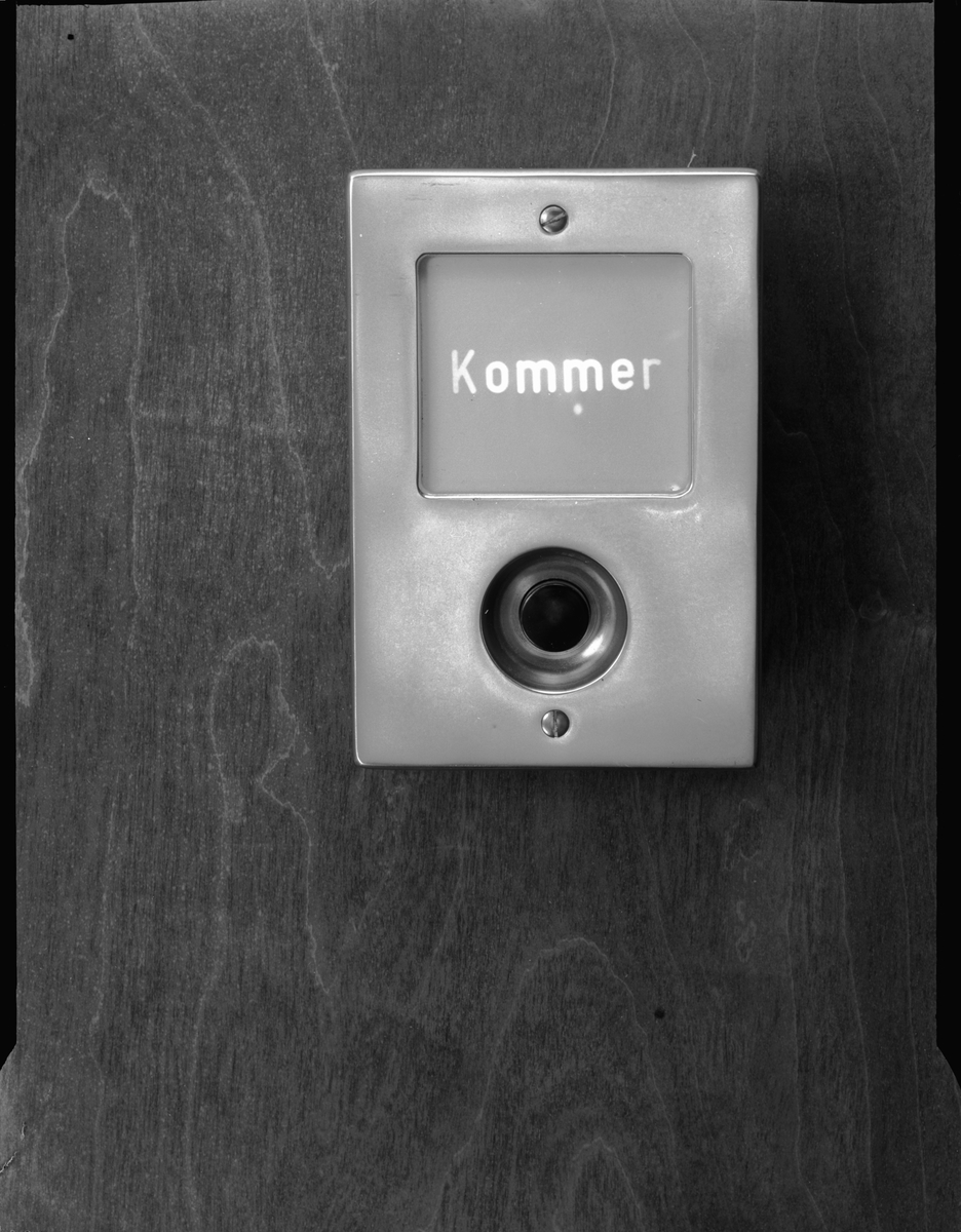 Hissknapp med tryckknapp i bakelit. Information om att hissen kommer.