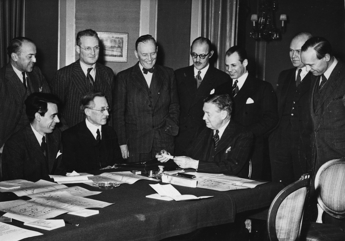 Stånde från vänster: Professor Ole Lamm, Civilförsvarsinspektör P. Skjöld, Konsul Eric Carlsson, Intendent T. Althin, Chefredaktör Carl Kreuger, Redaktör K.A. Larsson, Doktor T. Magnusson.
