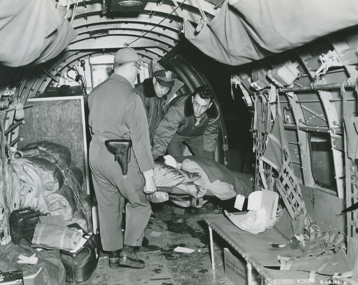 Fotografi från låda märkt Bernt Balchen. Balchen var norsk-amerikansk flygare, polarforskare och militär. Motiv av räddningsarbetare som lastar av en skadad man på bår från räddningsflygplan.